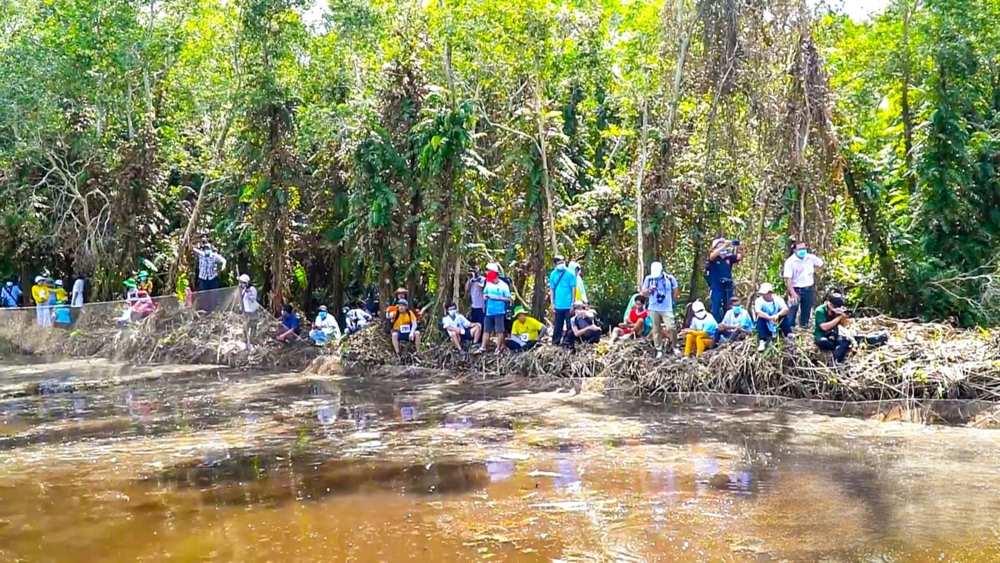 Đông đảo du khách hào hứng theo dõi và chụp hình trải nghiệm dỡ chà giữa rừng ngập mặn