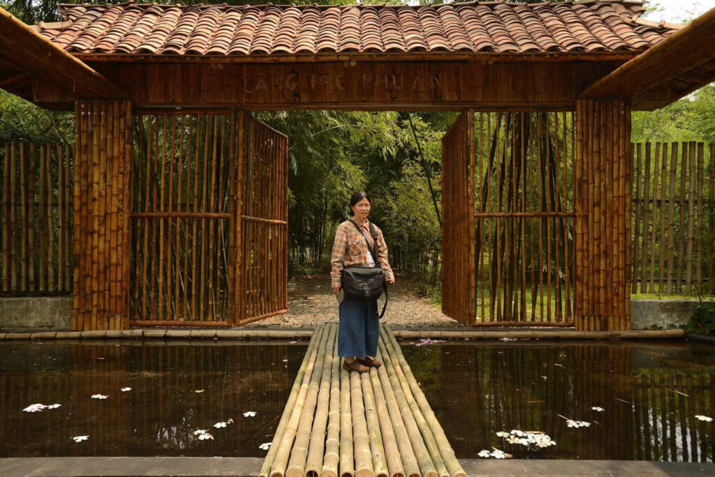 The entrance to the village immediately captivates with its nostalgic rural architecture: red-tiled roofs, a simple bamboo gate, and a small bamboo bridge crossing a quiet pond sprinkled with fallen blossoms. Passing through the gate feels like stepping into another realm – one filled with the rustling of bamboo leaves in the wind, the cheerful songs of birds, and the refreshing scent of earth and foliage.