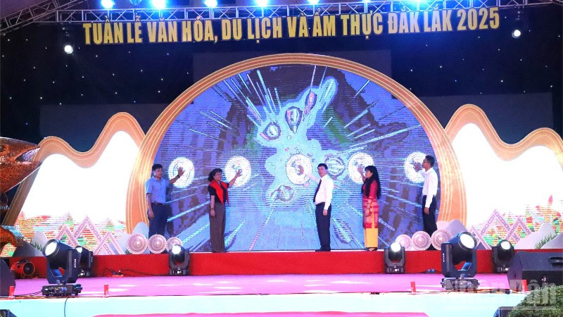 Các đại biểu ấn nút khai mạc Tuần lễ văn hóa, du lịch và ẩm thực Đắk Lắk 2025 (Ảnh: vhttdl.daklak.gov.vn)
