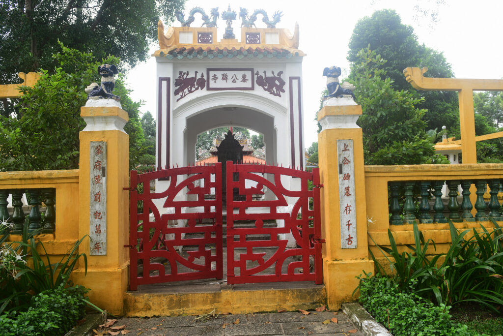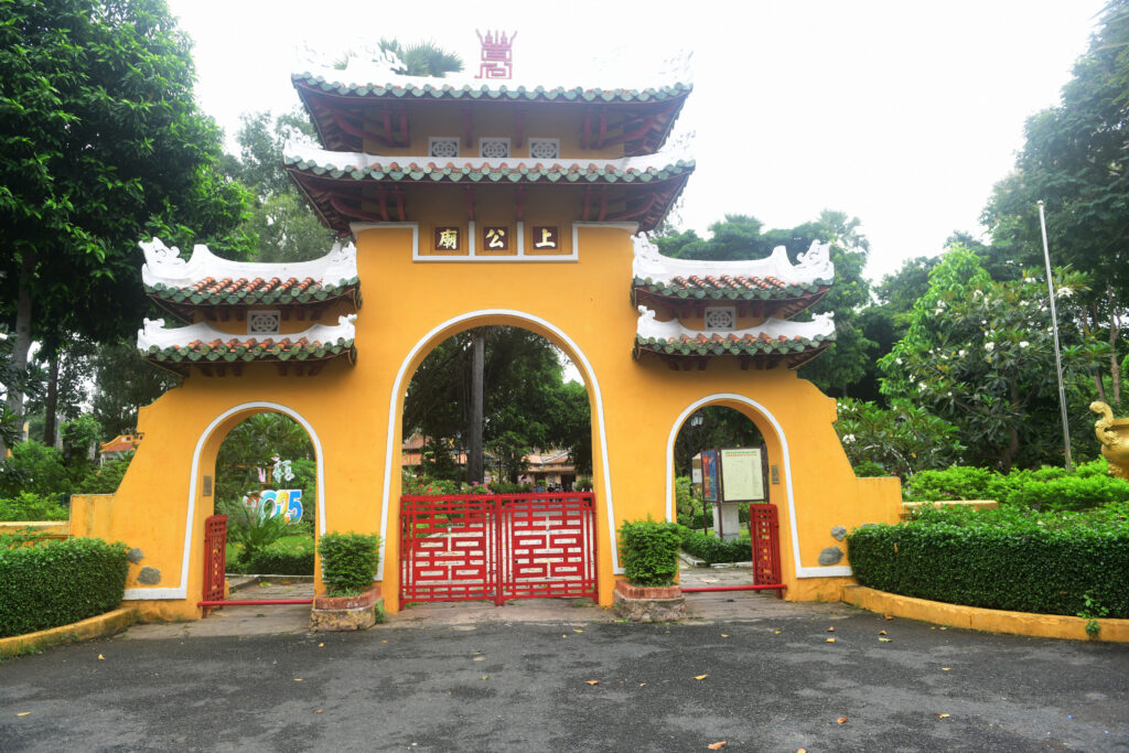 Cổng Tam quan Lăng Ông Bà Chiểu với mái ngói men xanh đặc trưng kiến trúc cung đình Huế, chữ “Thượng Công miếu” đắp nổi. Lăng xây dựng từ năm 1949. Ảnh: Phan Hưng