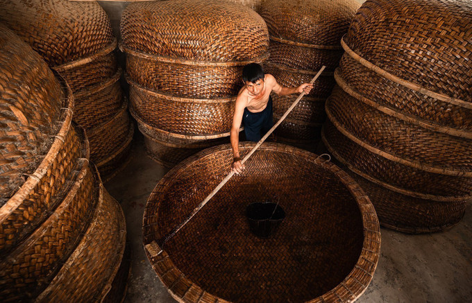 Nguyên liệu chính làm nên thúng chai là tre mỡ – loại tre dẻo dai, chịu nước tốt, được khai thác ven sông Nhân Mỹ (Phú Yên). Tre được chọn phải già độ 60% trở lên, sau khi chặt được lận vành, phơi khô rồi vót nan cẩn thận. Các công đoạn được phân chia rõ ràng: thợ vót nan, thợ đan mê, thợ lận vành, thợ trét dầu… tất cả đều cần sự phối hợp ăn ý để tạo nên một sản phẩm hoàn chỉnh.