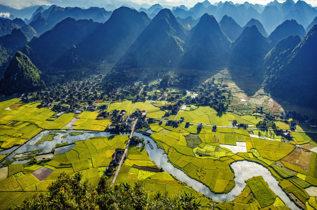 Điều đầu tiên khiến thung lũng Bắc Sơn chinh phục bất kỳ ai chính là cảnh sắc thiên nhiên kỳ vĩ. Nhìn từ trên cao, toàn bộ thung lũng hiện ra như một lòng chảo khổng lồ được bao bọc bởi những dãy núi đá vôi hùng vĩ, phủ xanh mướt mắt. Xen giữa màu xanh bất tận ấy là những cánh đồng trải dài, bất tận, khi xanh non, khi vàng óng, khi lấm tấm mạ non. Mỗi sớm mai, sương mờ giăng khắp triền núi, để rồi khi ánh nắng đầu ngày khẽ chạm xuống, cả thung lũng bừng sáng trong vẻ lung linh huyền ảo.