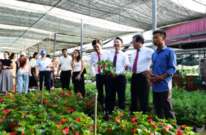 Các đại biểu, du khách trải nghiệm làng nghề hoa Tích Giang nhân dịp ra mắt tour “Sắc hoa Tường Phiêu”. Ảnh: TITC