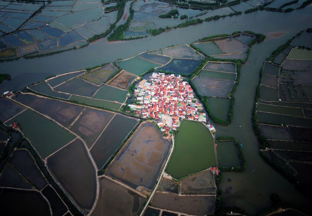 Nhìn từ trên cao làng Hà Liên nổi bật như một “ốc đảo cô đơn” giữa đầm Nha Phu. Ảnh: Internet