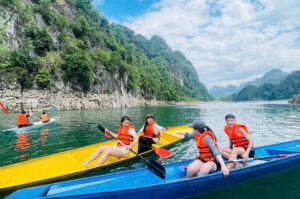 Du khách trải nghiệm chèo thuyền trên lòng hồ